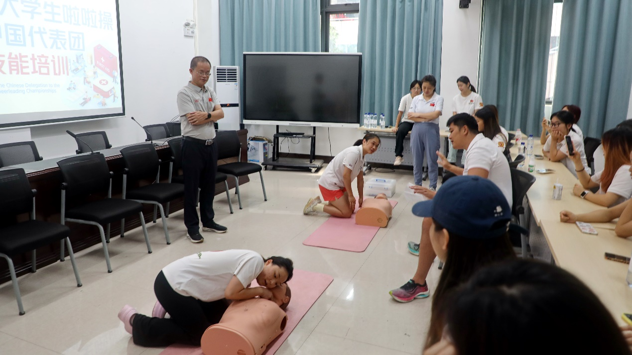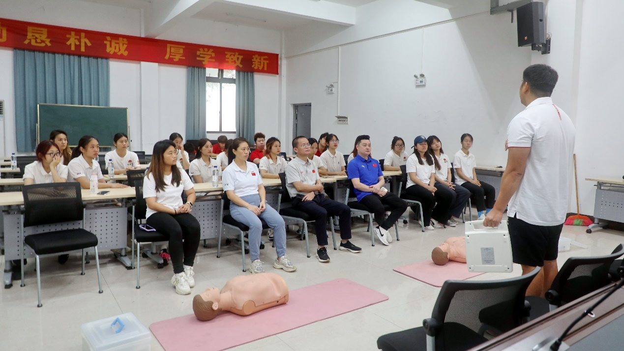 在培训过程中,郭旭霞老师、吴潮培老师为队员系统讲解心肺复苏、AED自动除颤仪使用、海姆立克急救法、运动损伤康复等应急救护知识和救护程序,耐心指导运动员进行实践操作,培训取得良好效果。