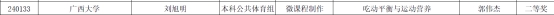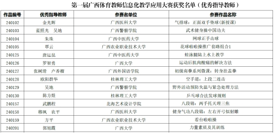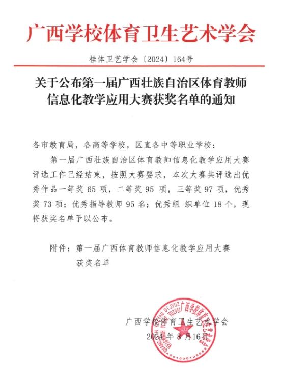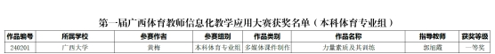 8月16日,第一届广西壮族自治区体育教师信息化教学应用大赛圆满落幕,公司教师表现出色,荣获本科体育专业组一等奖2项、二等奖2项,他们是:黄梅老师的多媒体课件作品《力量素质及其训练》、杨凝祺和伍尚柏老师合作制作的微课作品《运动后肌肉酸痛的解决方法》双双荣获一等奖,刘旭明老师的微课作品《吃动平衡与运动营养》和李秉健老师的微课作品《羽毛球正手击高远球》双双荣获二等奖。