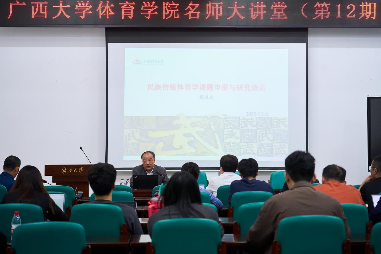 12月2日下午,上海体育大学武术公司戴国斌教授做客公司名师大讲堂,给公司师生作题为《民族传统体育学课题申报与研究热点》的专题讲座,韦雪亮副经理主持讲座。